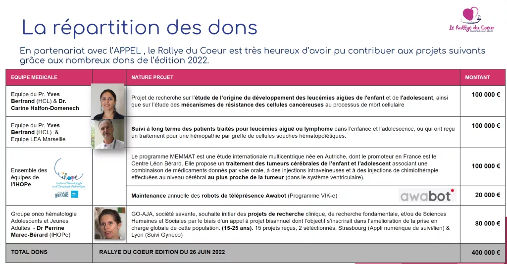 L’ APPEL – Association Philanthropique de Parents d’Enfants atteints de Leucémie ou autres cancers- est une association lyonnaise a pour but de réunir toute personne touchée par la leucémie et autres cancers de l’enfant et de l’adolescent. Elle vient en aide et cherche à améliorer la qualité de vie des enfants et de leurs familles à l’hôpital. Elle intervient auprès de l’IHOPe (Institut d’Hématologie et d’Oncologie Pédiatrique) à Lyon et de l’ICL (Institut du Cancer de la Loire) à Saint-Étienne.